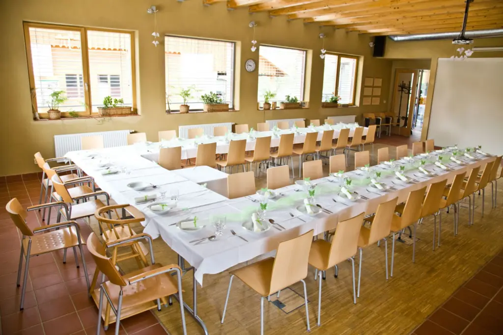Stravování je nabízeno ve vysoké kvalitě: vaří se s širokým využitím biopotravin, výrobků Fair Trade, bez použití polotovarů, využívají se místní suroviny. Nabízí se výběr mezi vegetariánskou, veganskou a masitou stravou – tu se snažíme omezovat. Naše stravovací skupiny jsou malé – i při využití celého penzionu, proto je velmi náročné zajistit ekonomiku kuchyně při vysokých nárocích na kvalitu. Finanční zisk přináší i výdělek na službách centra pro školicí účely. Seminární sál je pronajímán pro konání seminářů, workshopů, konferencí a školení pořádaných jinými organizacemi, a také pro pobytové rekreační a rodinné akce (oslavy narozenin, svatby). To usnadňuje dohoda s obcí, že pro účely oslav občanů Hostětína a akcí hostětínských spolků je pronájem sálu zdarma. Spolky a rodiny místních si pak obvykle platí občerstvení přichystané kuchařkami v pasivním domě.