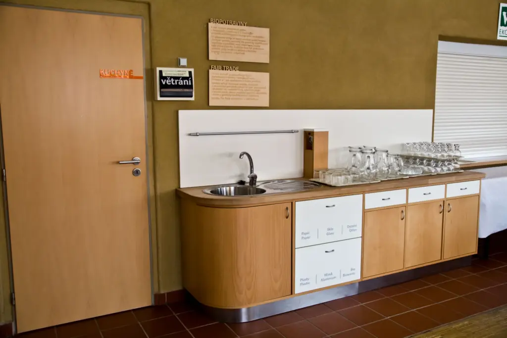 V kombinaci s ostatními nároky na vybavení (finanční dostupnost, trvanlivost, skladovatelnost apod.) nebylo vždy jednoduché najít ekologicky příznivý místní materiál a místního výrobce. Například u nábytku byl kladen důraz na provedení z masivního dřeva, s co nejmenším podílem lepidel a k přírodě šetrnou povrchovou úpravou (voskovým olejem). Nábytek byl zčásti vyroben ze dřeva s certifikátem šetrného lesního hospodaření FSC, které pocházelo ze Školního lesního podniku Mendelovy univerzity – v té době jednoho z nejbližších certifikovaných lesních majetků. Ložní prádlo a ručníky na pokojích jsou certifikovány jako Ekologicky šetrné výrobky. Kuchyně je vybavena spotřebiči energetické třídy A. V roce 2012 byla v centru zřízena učebna ekologické stopy, která v praxi představuje uskutečněná opatření na úsporu energie. Obsahuje také kuchyňské spotřebiče nejlepší energetické třídy a ukázku ekologických postupů v domácnosti při úklidu, bydlení, nakupování či dopravě.