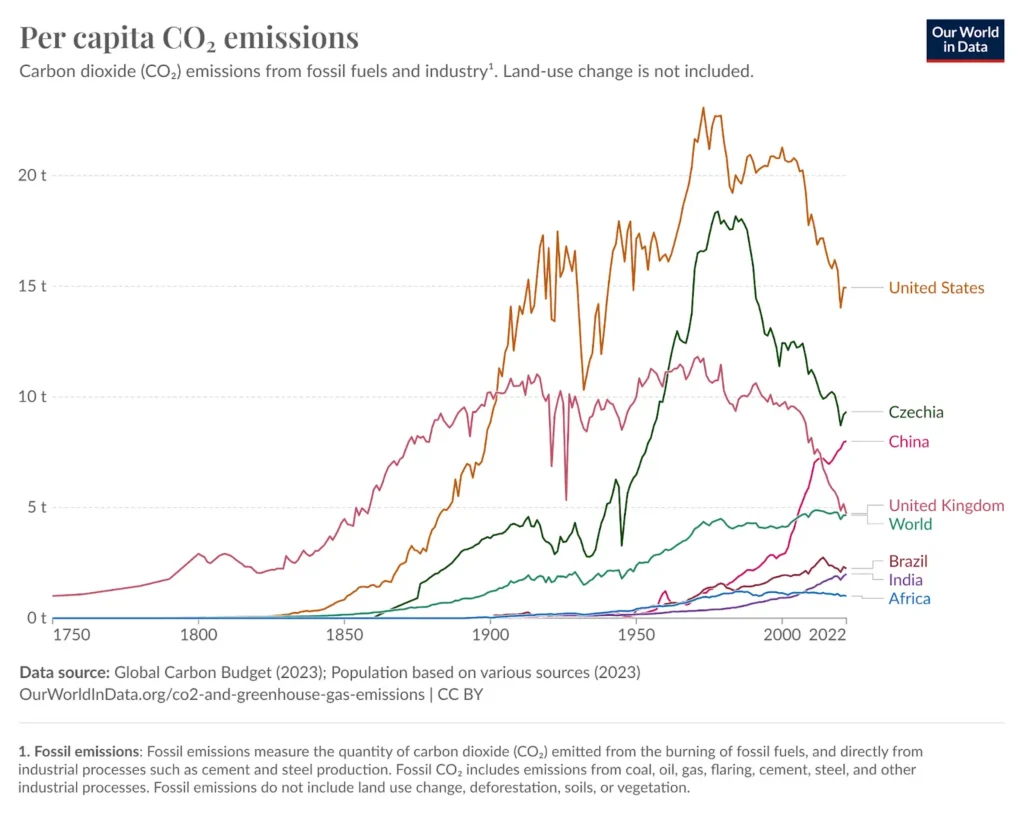 Vzhledem k tomu, že oxid uhličitý, hlavní skleníkový plyn způsobující změnu klimatu, zůstává v atmosféře stovky let, musíme brát v úvahu nejen naše současné emise, ale také příspěvky jednotlivých zemí v průběhu času. Zdaleka nejvíce jsou za klimatickou změnu zodpovědné USA, které vypustily více než 20 % všech emisí. Země EU jsou v těsném závěsu.