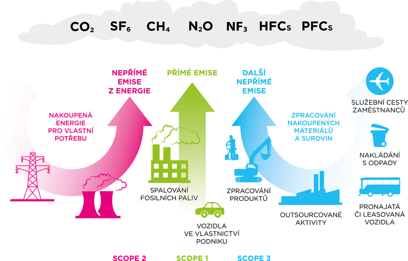 - Další nepřímé (Scope 3) emise jsou spojené s činností organizace, ale ta je přímo neřídí. Patří sem například emise produkované dodavateli, během dopravy výrobků, při jejich využívání zákazníky nebo při zpracování vzniklého odpadu.